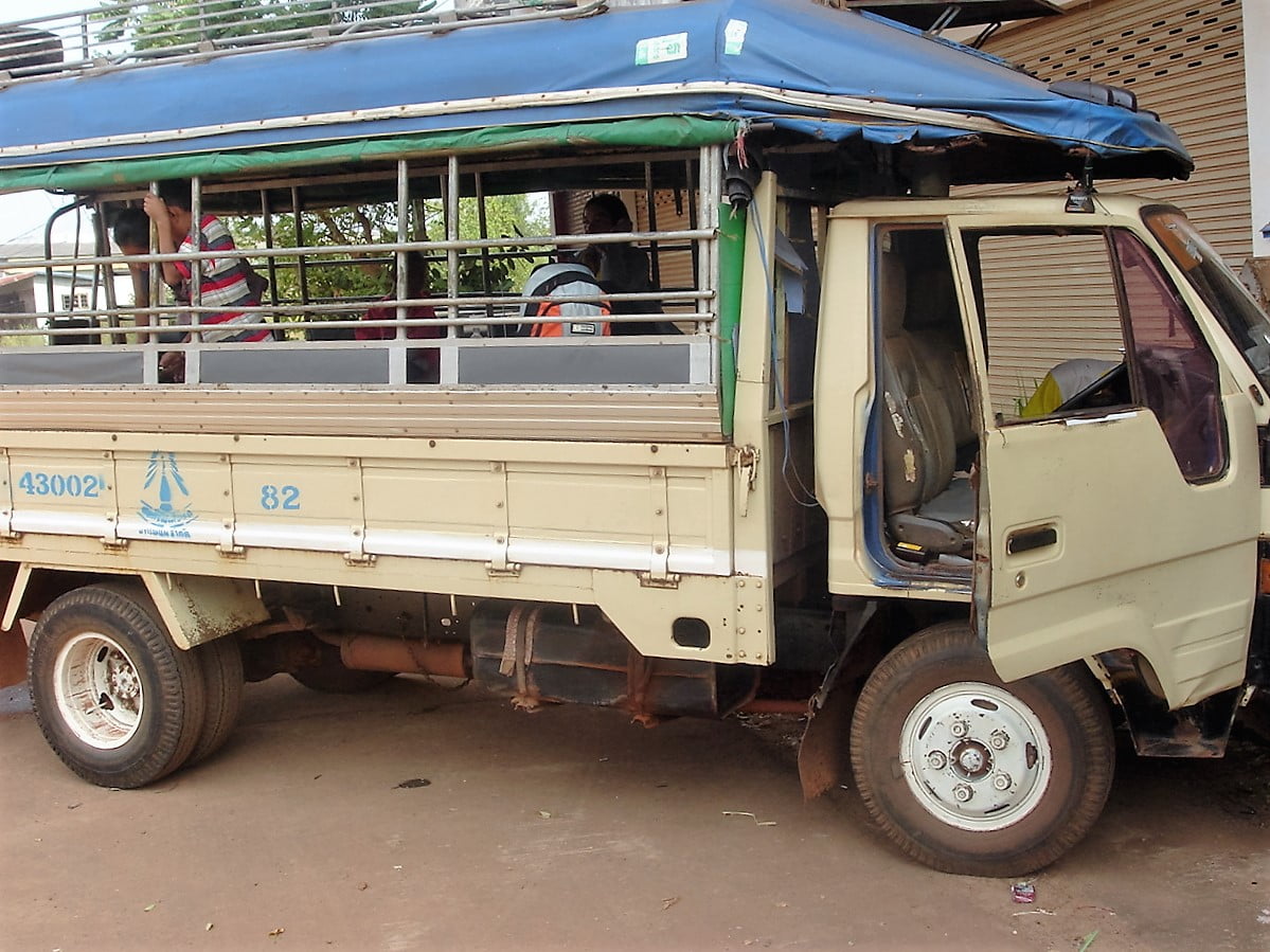 Om zes uur rijdt ‘de bus’ voor. Achter de chauffeurscabine van het mini-vrachtwagentje zit een kooi op de laadbak, met aan de zijkanten twee banken voor de passagiers. Ik beklim het trappetje aan de open achterkant van de reizigerskooi en wurm me langs manden vol bananen; die gaan uiteraard naar de markt in Nahkon Phanom. Het is al gezellig druk in de bus – marktvrouwen, schoolkinderen, boeren, mijn verloofde en ik – en dat betekent behoorlijk inschikken om iedereen een zitplaats te gunnen.